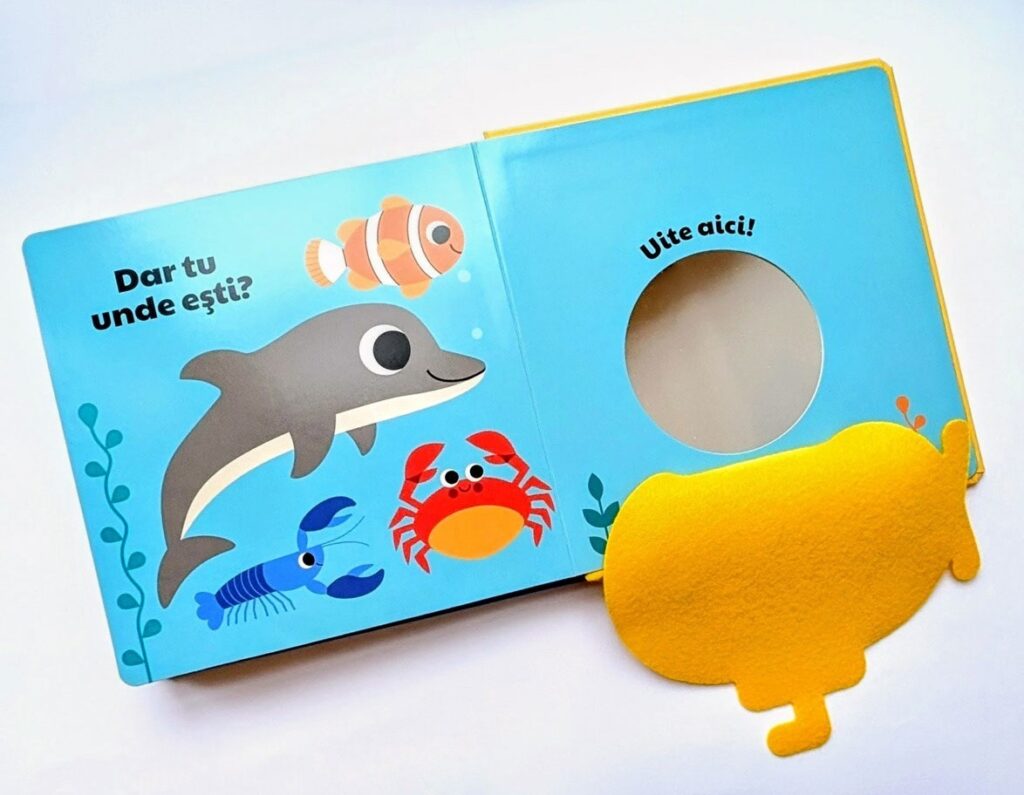Jocul preferat al bebelușilor – Cucu-bau! – a fost transformat într-o carte interactivă. „Unde e Doamna Pește?” oferă copiilor mici o experiență tactilă plină de surprize, special gândită pentru dezvoltarea lor.